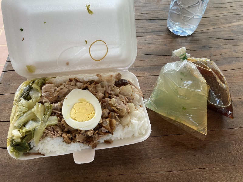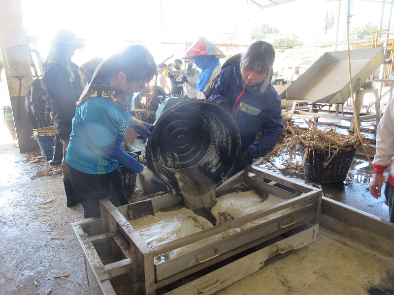 さて、今度はサトウキビからの搾汁です。サトウキビ畑から次々と運ばれてくるサトウキビをひたすら専用の搾汁機に投入します。つぶしてサトウキビの中から糖を含んだ液体を絞り出し、ラム酒をつくるための原料とします。どれも力仕事です。この搾汁作業を担当しているLAODIスタッフは全員女性です。女性が活躍する職場なのです。作業がおわったらお昼御飯でした。カオカーム―というお弁当でしたが、仕事の後のご飯はとってもおいしかった!
