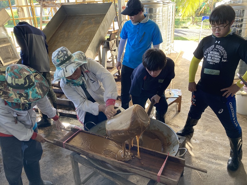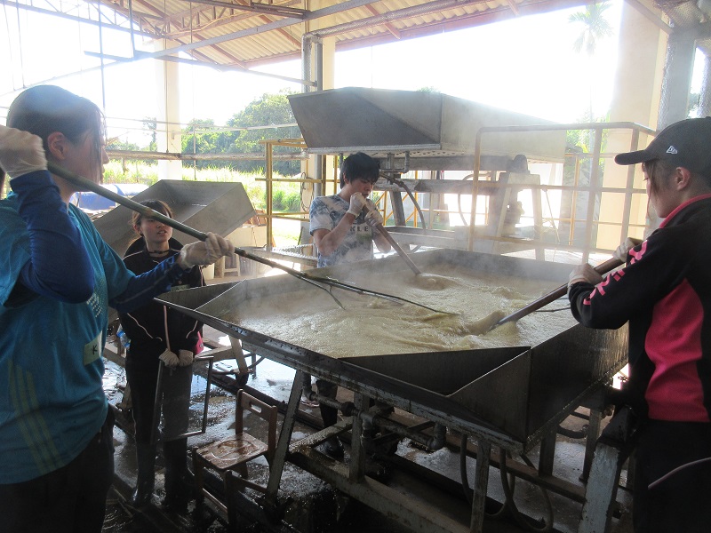 今度は白玉糖づくりです。これは、簡単に言うと、サトウキビの搾汁液を煮詰めて固めた砂糖のことで、高知県芸西村伝統のスイーツです。ぐつぐつと煮詰めた搾汁液のpHを調製し、布でこしとり、香りづけにラム酒を加えて、最後にはひたすらかき混ぜます。1日室温で固めて、カットしてお土産としました。これだけの量の白玉糖は相当な額になるとか。以下はその作業風景です。写真が多いですが、どうぞ。