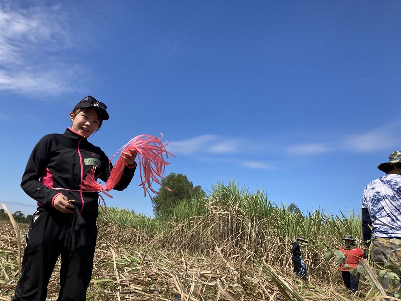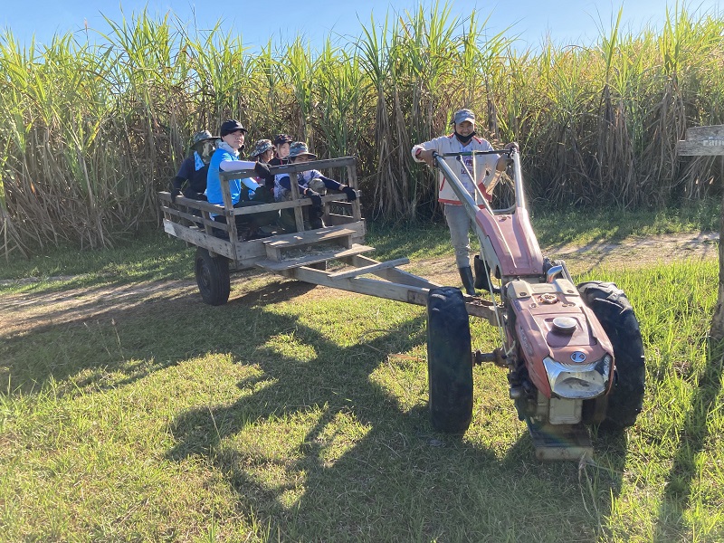 サトウキビ畑は広大なので、専用車で移動しました。短い距離をゆっくりと移動するのですが、ガタガタと揺れる荷台に乗る経験は大変印象的だったと思います。それにしても、初日は大変天気が良く気持ちが良かったです。