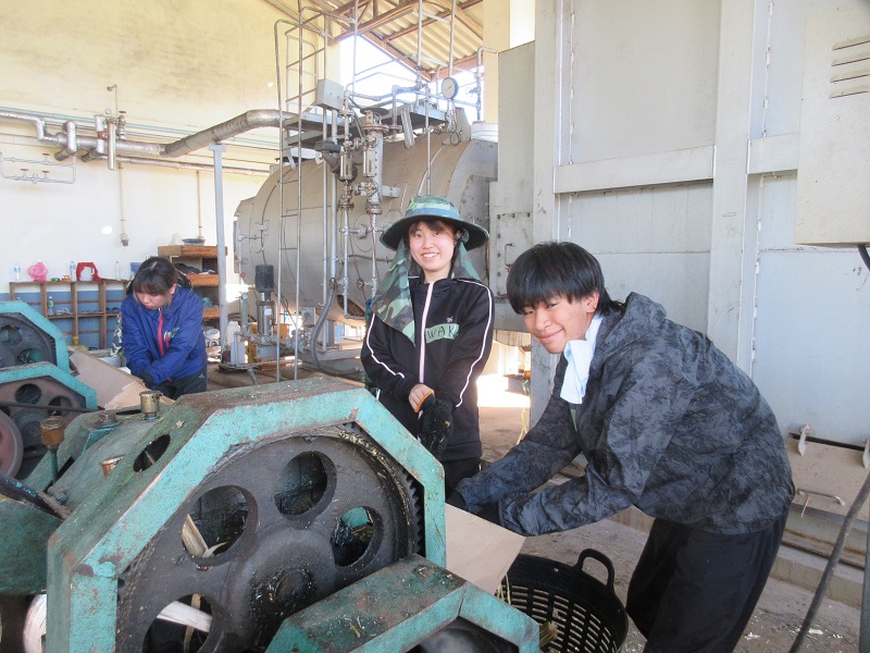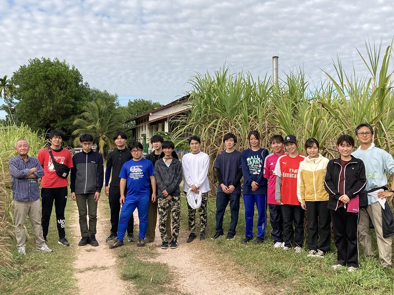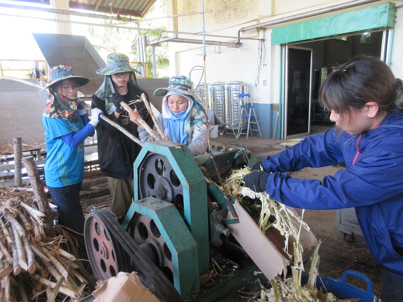 LAODI社は、Lao Argo Organic Industries 社の略で、今や世界を舞台に活躍するラム酒メーカーです。会長で醸造責任者の井上育三さんは、福山市のご出身で、本学でも非常勤講師をしているというつながりがあり、今回のLAODIでの研修が実現しました。LOADIには広大なサトウキビ畑があり、学生たちはサトウキビの刈り取りから搾汁作業、搾汁液から白玉糖の作成、そしてラム酒製造過程の学習を体験しました。井上さんのガイダンスの後、学生には一人一人研修に対する思いを語ってもらいましたが、学生の言葉は研修に対する期待にあふれるものでした。以下の写真は、LAODIのサトウキビ畑と思いを語る学生です。