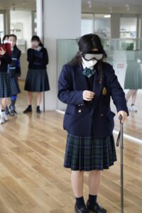 ゴーグルをつけて歩きます。安全のため友達が支えます。