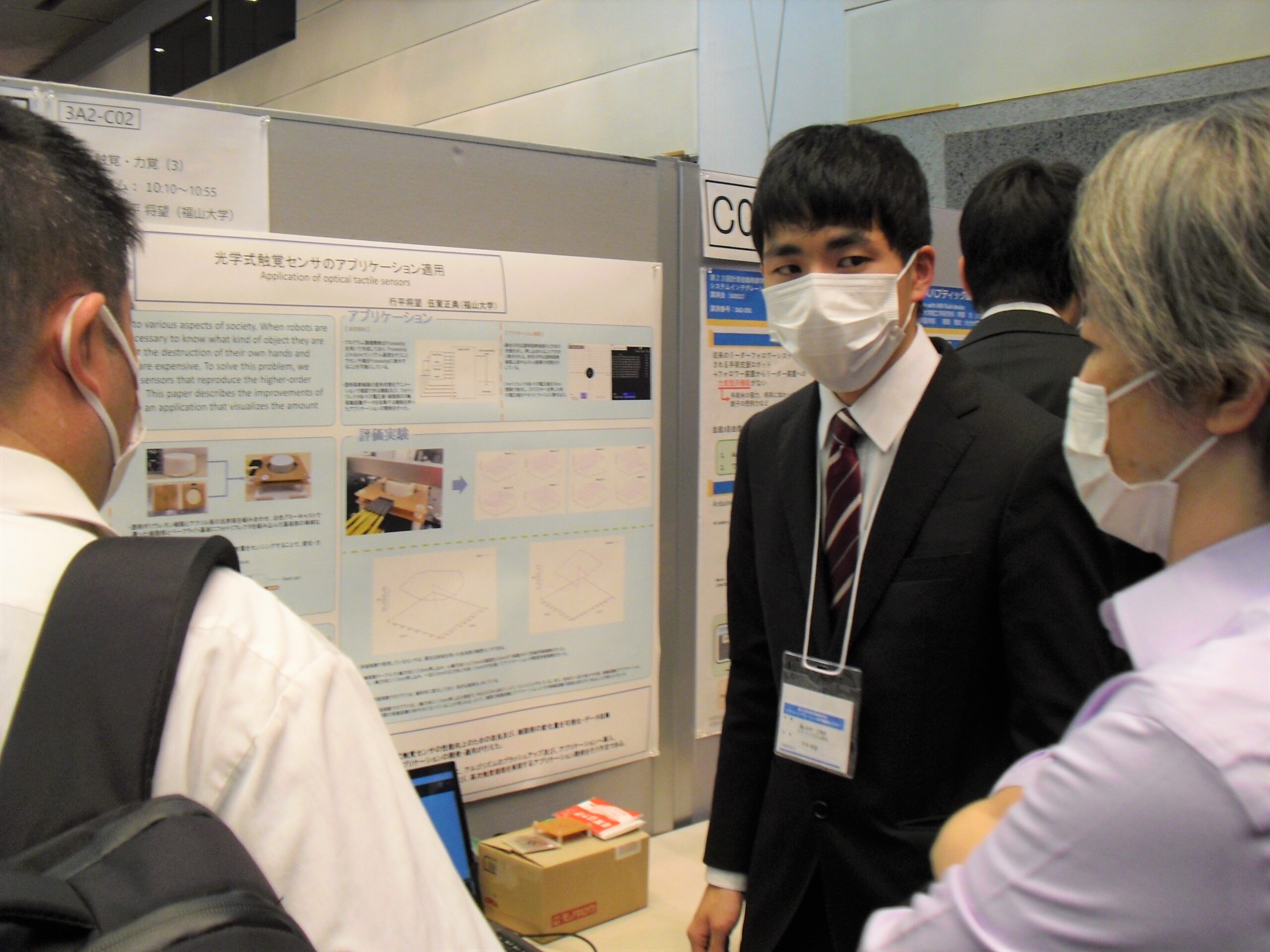 同じく私(伍賀研究室)のゼミ生で、4年生の行平将望君は、卒業研究でも取り組んでいる「光学式触覚センサのアプリケーション適用」の題目を12月16日(金)の触覚・力覚(3)のセッションで発表しました。これは、私のゼミが長年取り組んでいる「光学式触覚センサ」の開発の一貫で、行平君が新規デバイスとしてまとめてくれました。