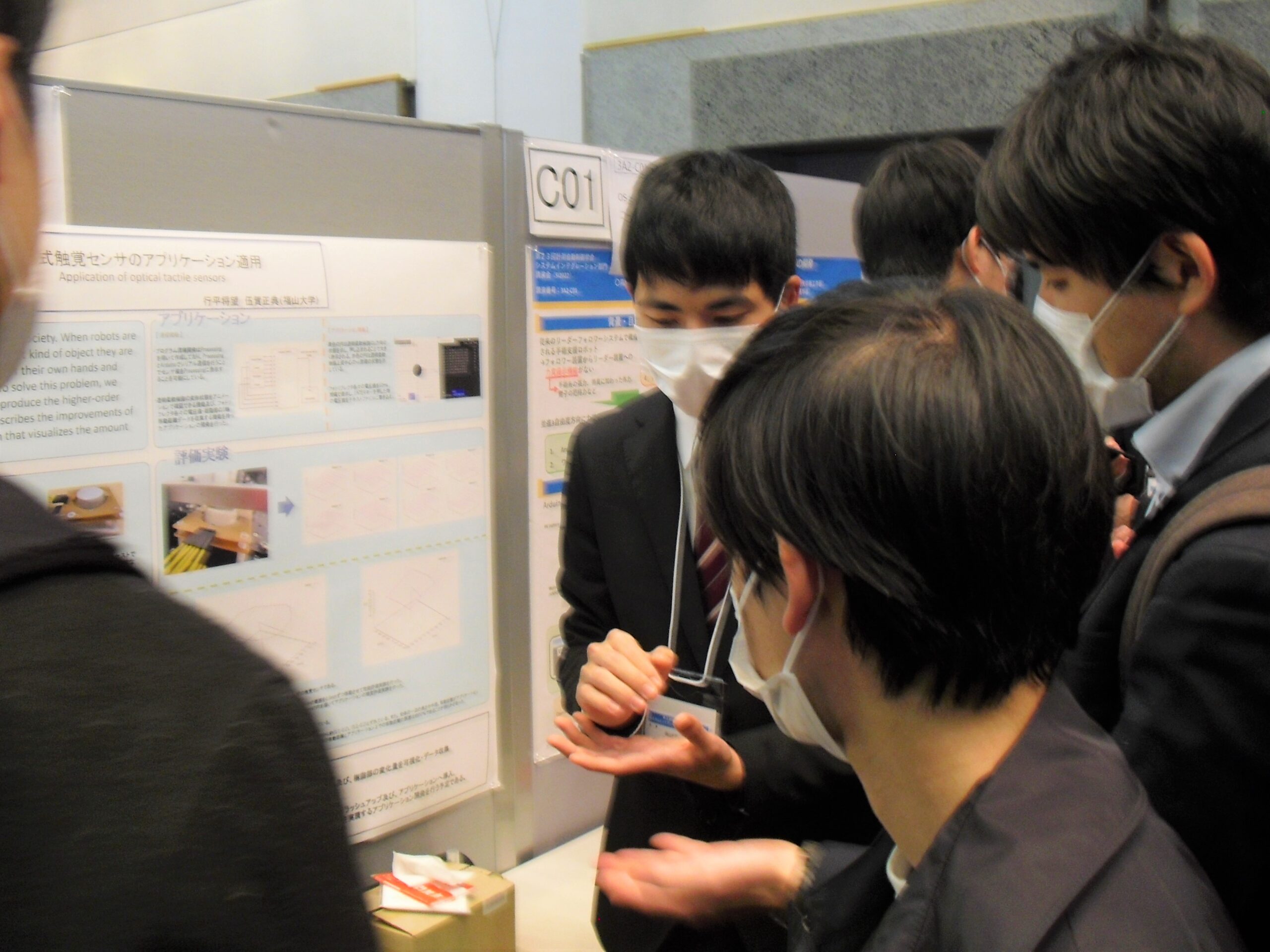 このインタラクティブ発表でも、行平君は現在開発中の触覚センサとPCで製作している触覚の視覚化アプリケーションを展示して、デモンストレーションを実施しました。ロボットハンドや触覚力覚センサの研究に携わっている多くの研究者の注目を浴び、活発な質疑応答やコメント・アドバイスを受けていました。行平君は卒業研究にとりかかっている最中ですが、この経験を活かしてレベルの高い卒業研究を完成して欲しいです。