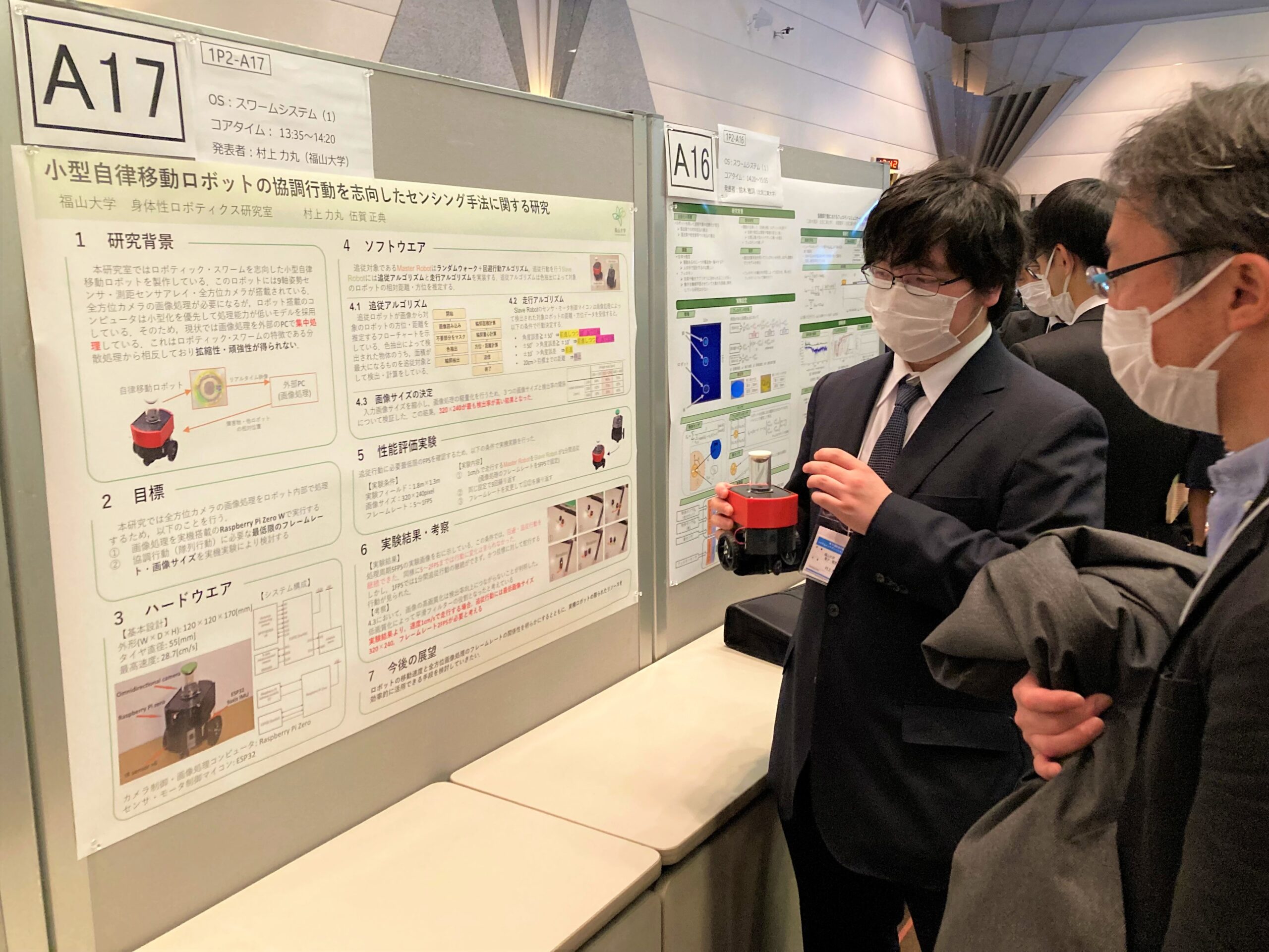 私(伍賀研究室)のゼミ生で、大学院工学研究科電気・電子工学専攻1年生の村上力丸君は「小型自律移動ロボットの協調行動を志向したセンシング手法に関する研究」の題目で、12月14日(水)のスワーム(1)のセッションで発表しました。スワームとは「群れ」のことで、蟻や蜂のような集団で行動する小型ロボットを提案し、研究しています。インタラクティブ発表では、研究室で開発している小型ロボットを会場に持ち込んで、デモンストレーションをしながら解説をしていました。多くの研究者の方々からコメントや助言をいただきました。