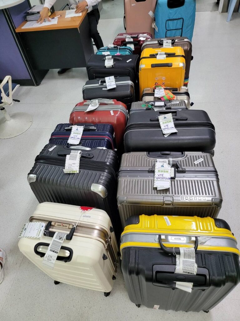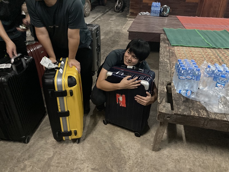 ここまで読んでいただきありがとうございました。最後に、首都であるビエンチャンでの様子を少しだけお伝えします。上で書きましたように、初日にビエンチャン ワッタイ国際空港に到着した際に、15名全員分のキャリーケースが届きませんでした。トランジットで、キャリーケースの移動がうまくいかなかったようです。これも旅の経験です。むしろ、キャリーケースが届かなかった時の悲しみと、届いた時の嬉しさを共有したことでメンバーの絆が深まったと感じます。マイナスがあるからプラスを感じることができるのです。まるで人生です。とにかくそんな状況でも学生は終始元気な様子であったので救われました。そういう事態となったため、初日に予定していたビエンチャン市街をめぐることはできませんでしたが、最後の日に学生たちは個々に名所を訪問したようです。よかったよかった。下の写真は1日遅れで届いたキャリーケース。