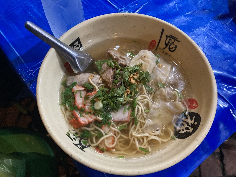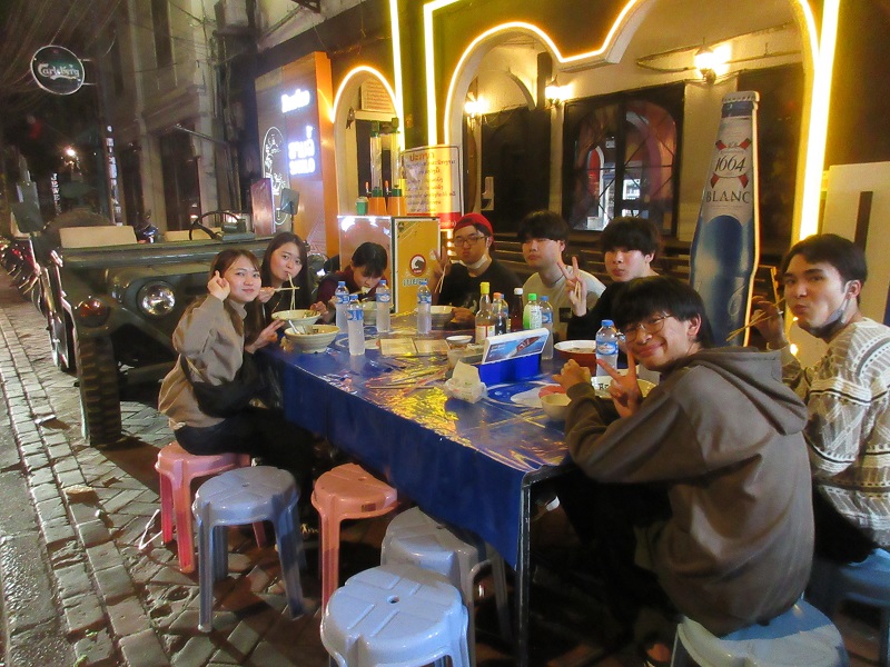 ビエンチャンの街中では朝早くから夜遅くまでラーメン屋が開いているので、朝昼晩いつでも食べることができます。味はあっさりしていて、日本人好みの味です。下の写真は初日の様子で、ビエンチャンのホテルに到着後すぐ21時過ぎ(日本の23時過ぎ)に食べに行ったラーメン店です。空港ではなんと全員分のキャリーケースが届かず(下記)、その手続きで疲れ果てました。最初の食事は旅の疲れた体に元気を与えてくれました。