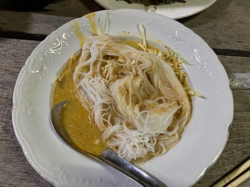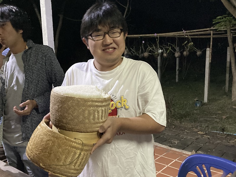 まずは食事です。ラオスと言えばカオニャオです。籠に入ったもち米を手で取って丸めて食べます。辛いおかずと一緒に食べると、とってもおいしいです。ラオス料理については学生にとって辛い食べ物とパクチーが乗り越えるのが難しい壁だったようですが、これも経験ですね。日本でもたまに食べることがあるココナッツミルクの入った辛いタイ風の味付けもあり、おいしかったです。
