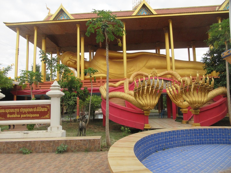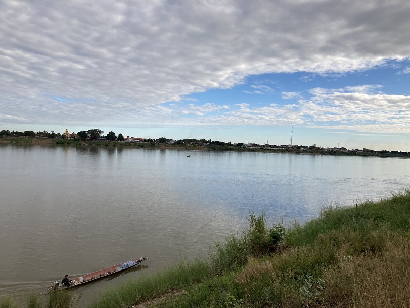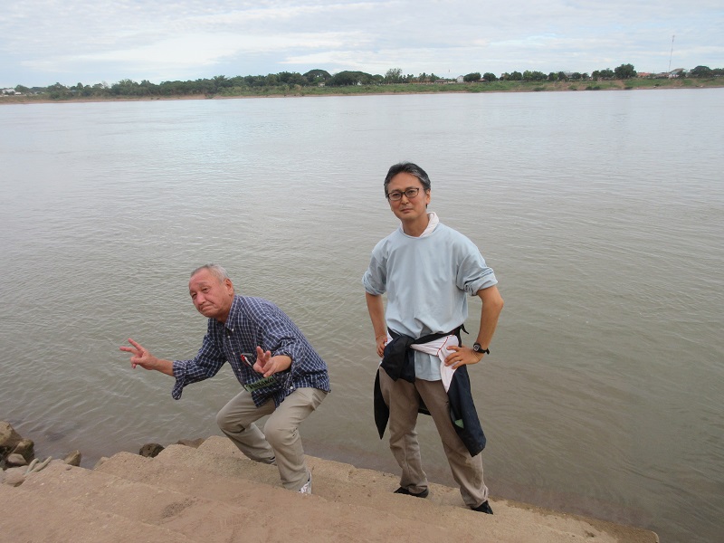 次にメコン川とお寺の訪問の様子をお伝えします。メコン川は東南アジアを代表する大河川で、その源はチベット高原にあります。メコン川の向こうはタイ。ラオスの南部では、メコン川はタイとの国境となっています。この時期、流れは緩やかで優雅に流れていました。海のないラオスでは、メコン川は大きな水源です。近くには農家も多く、ラオスの食を支えています。日本の川とは雰囲気の違った雄大な川の流れの前で記念撮影しました。