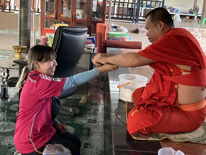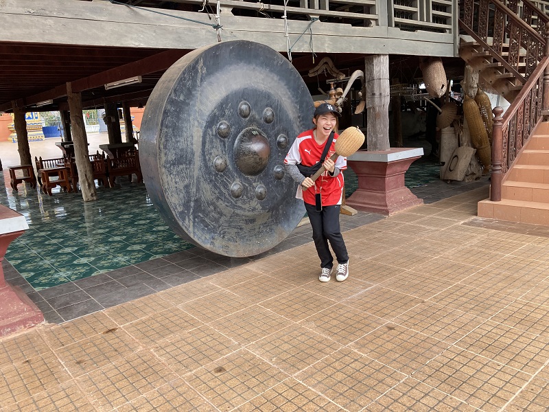 さてメコン川の近くにお寺があったので、訪問しました。幸せを呼ぶドラムがあったため、「幸せになりたい!」と、みな力いっぱいドラムをたたいて鳴らしたところ、ドラムのバチが折れてしまいました。正直にお寺の住職に謝りに申し出たところ、怒られることもなく、一人一人の幸せを願うミサンガを手首に括りつけてくれました。住職には感謝以外にありません。お寺では皆で日本に無事に帰ることができるように祈りました。それにしてもどれだけ幸せになりたいのだろうか。。。