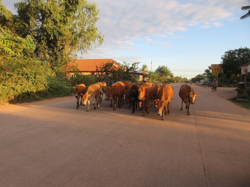 メコン川とお寺を訪問した後、小さな町を通り過ぎる際に、道路で当然のごとく歩いている牛に遭遇しました。日本では見ることのないラオスの原風景ですね。