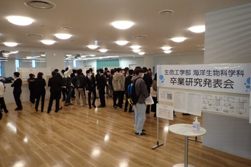 今年度は学科に新たに2研究室が加わり、12研究室による多彩な研究テーマがありました。分野は水産養殖、生態系調査、環境保全、系統分類、アクアリウム飼育、展示教育、防疫、食品機能解析等にわたり、扱う対象もイルカ、魚類、クラゲ、甲殻類、海藻、微細藻類、細菌、化学成分、遺伝子等、とても多岐にわたるものでした。