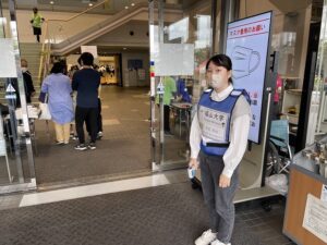 「ふくやまスポーツフェスティバル」で受付と発熱チェックを担当している学生スタッフ