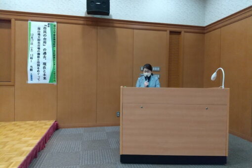 基調講演後には、福山地方卸売市場の過去、現在と未来に関する具体的パネル報告が行われました。具体的には、張楓教授(福山大学経済学部)による「福山生鮮食料品市場の『百年』と福山地方卸売市場の水産部門」、植田展大准教授(立命館大学経営学部)による「福山地方卸売市場の青果部門の歴史的展開」、池田幸博様(福山地方卸売市場・市場長)による「福山地方卸売市場の再整備過程~新たな『市民の台所』をめざして~」の3報告でした。張楓教授は、報告に先立ってシンポジウムの企画者として、福山地方卸売市場をテーマとするシンポジウムの開催に至る経緯を次のように簡潔に説明しました。
