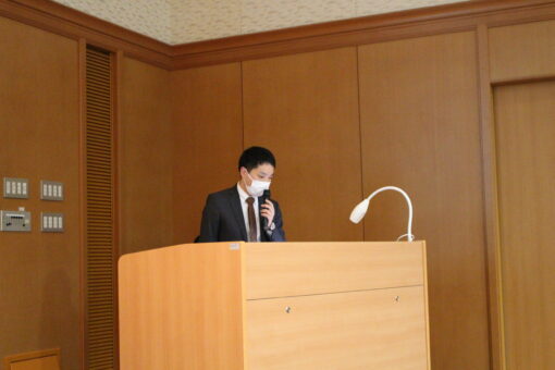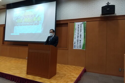 「生命工学部海洋生物科学科の有瀧真人教授が、福山大学ブランディング事業「瀬戸内の里山・里海学」の一環として進められている、地元企業の株式会社クラハシとのシロギス養殖研究開発に地域産業史研究者として好奇心を強くそそられ、有瀧教授の紹介でクラハシに2019年に訪れたことに始まりました。今、振り返りますと、自分は「不思議の国のアリス」のように、クラハシという白いウサギを追いかけながら、不思議で奥深い世界にすっかりと魅了された挙句、2年ほど前から福山地方卸売市場50周年誌の編纂を任されることとなりました。今日のパネル報告とシンポジウムは、福山地方卸売市場50周年誌の編纂の研究成果を披露するにとどまらず、企業・行政・市民間の対話を深めたいと考えております。」
