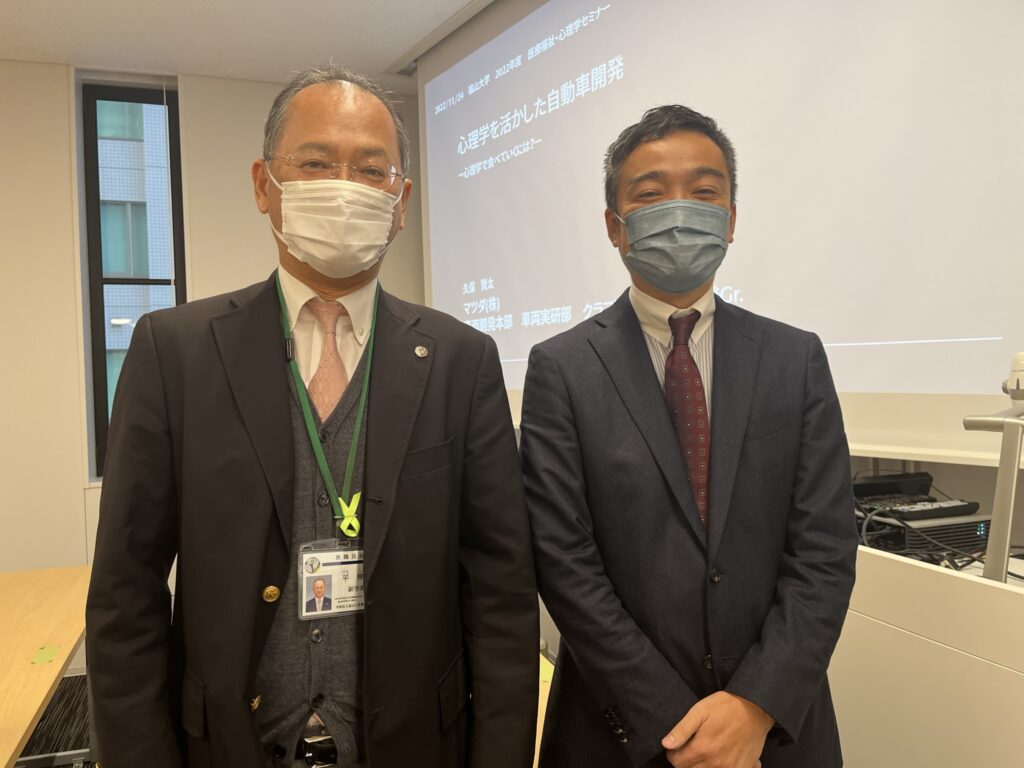 学長から一言:人が使う商品や技術ですから、自動車開発でも人の気持ちや関心にピッタリのものを追究すべきであることはよく分かります。そこで人の心や気持ちの奥深いところを探る学問である心理学の出番。もともと心理学がご専門である今回のセミナー講師の実践経験を踏まえたお話はズシンと参加者の心に響いたことでしょう。