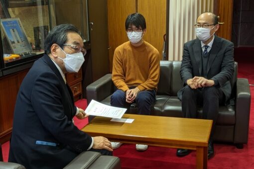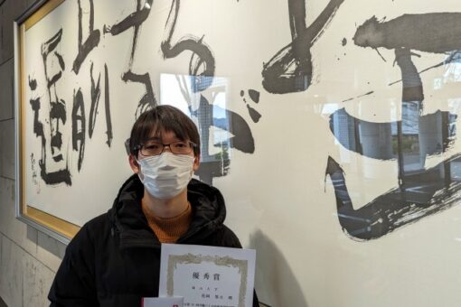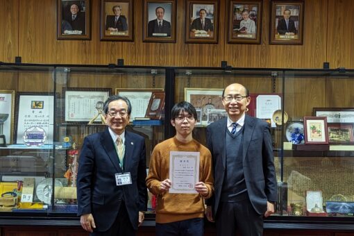 その中で、全国の成績トップ1%の人が対象となる優秀賞に3年生の花岡悠太君が選ばれ、学会から賞状と副賞が送られてきましたので、1月27日(金)の午前11時から学長室で大塚豊学長による伝達式が行われました。その時の様子を、写真と動画で紹介します。以下、花岡君へのインタビューです。