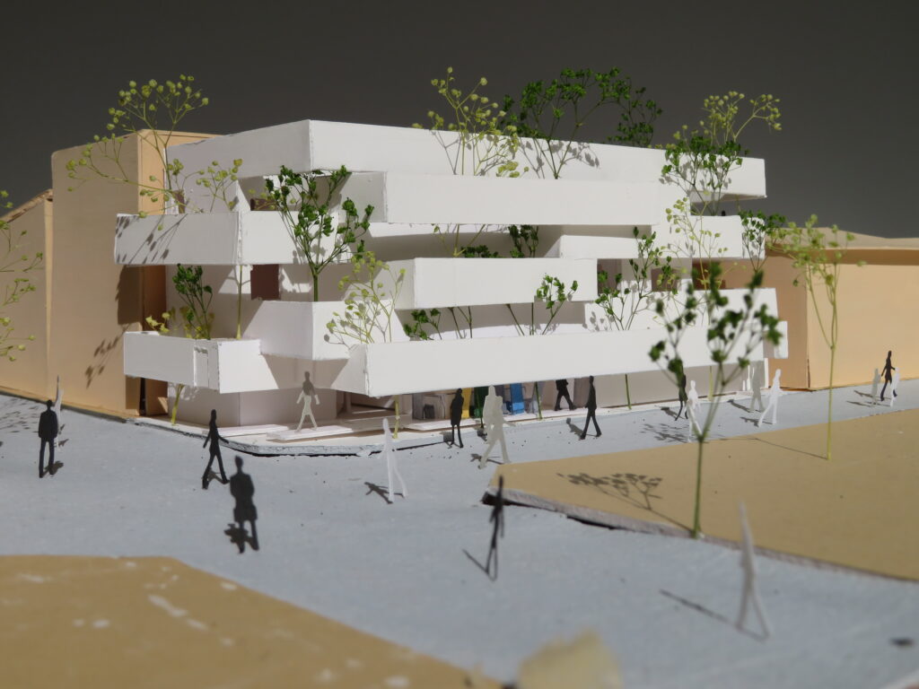 今回は、広島県福山市の久松商店街の一角に低層の集合住宅を設計するという建築設計演習Ⅱの課題をブラッシュアップし、「積もる帯につつまれて」というタイトルを付けて応募しました。「帯」に見立てた高さの低い壁をズラしながら積み上げることを空間構成原理とし、商店街の景観、居住者の住みやすさなどに配慮した設計となっています。