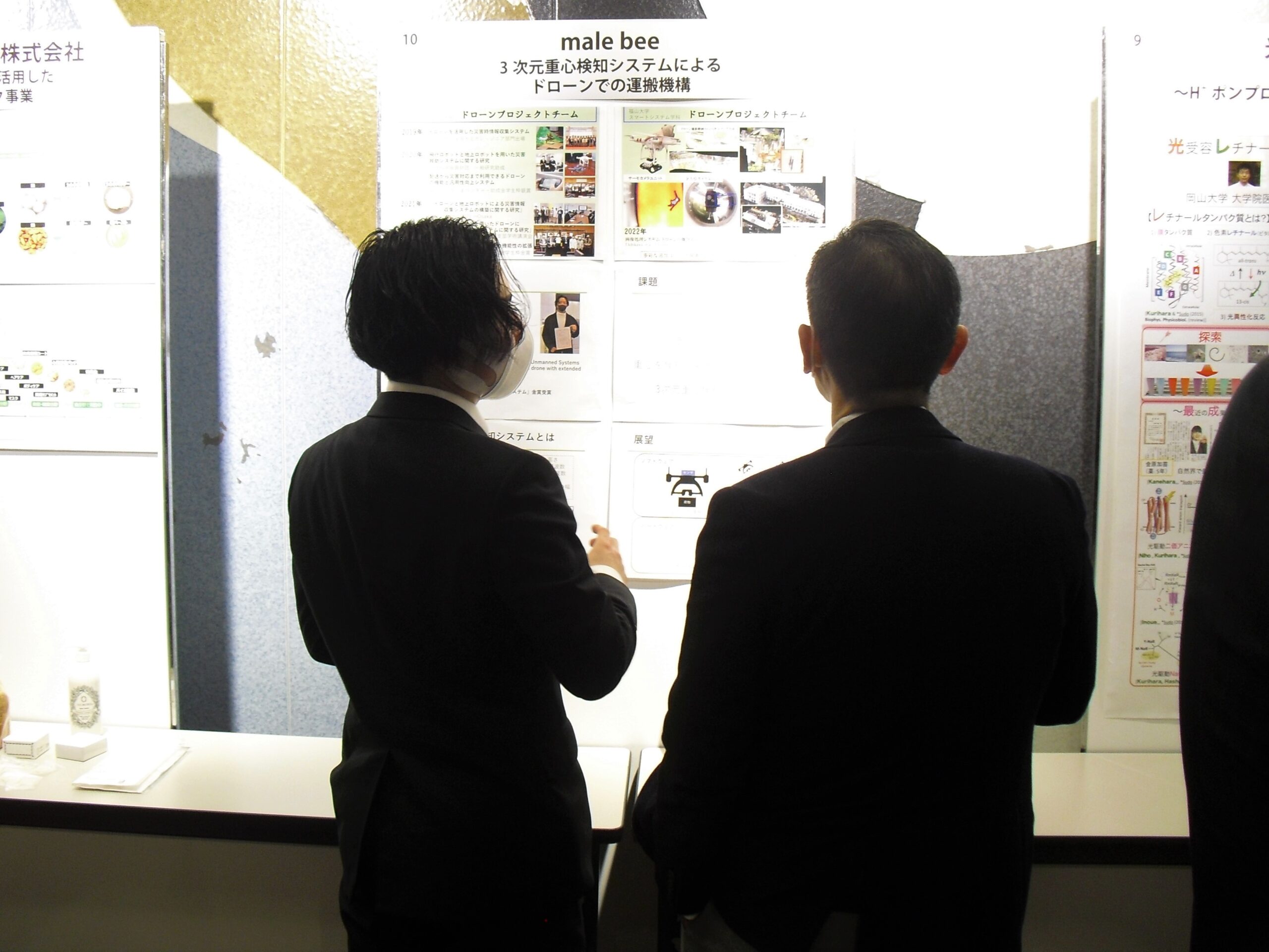 また、発表会場の外にはポスター発表ブースが設けられ、選考会の間の休憩時間には多数の研究者や起業支援の方々がブースを訪れ、我々の研究プロジェクトの説明を聞いていただきました。この発表には、山田君が3年生の学生実験:スマートシステム応用実験の大実験の研究テーマで取り組んだドローンを使った画像処理をデモ展示しました。