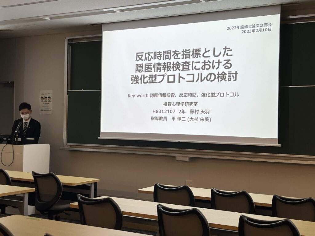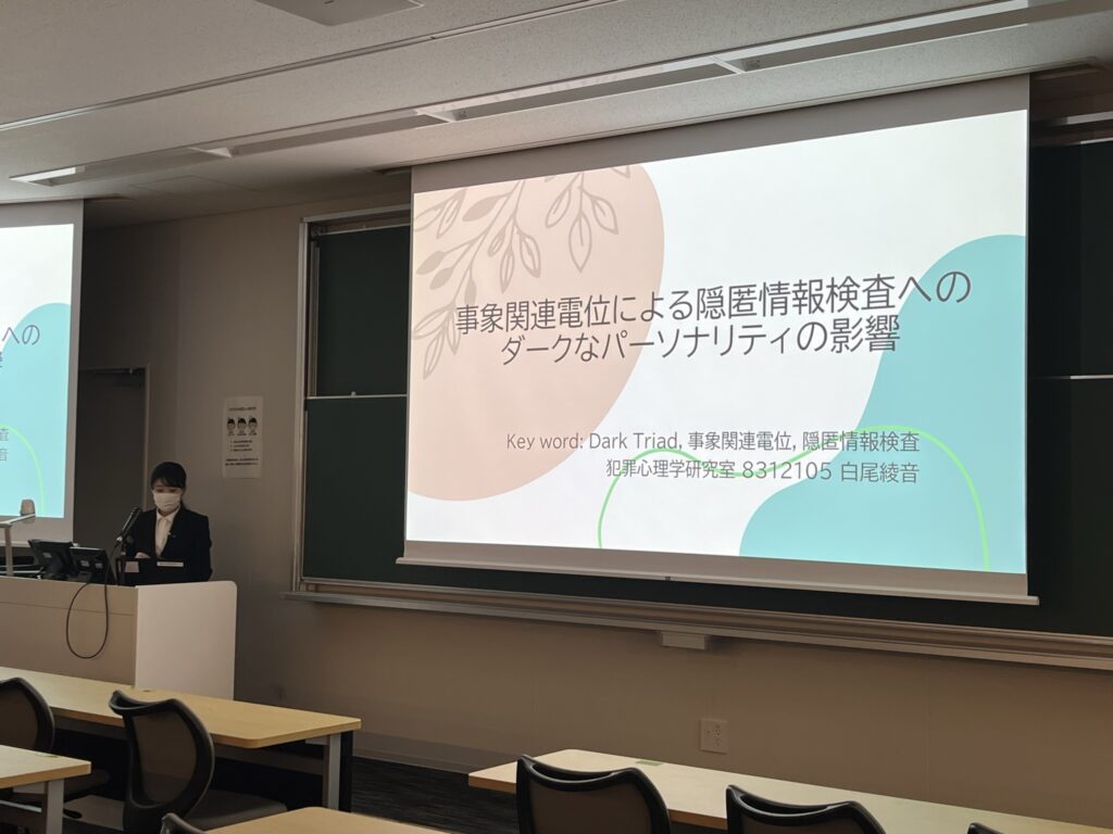 - 藤村天羽さん(捜査心理学研究室)「反応時間を用いた隠匿情報検査における強化型プロトコルの検討」