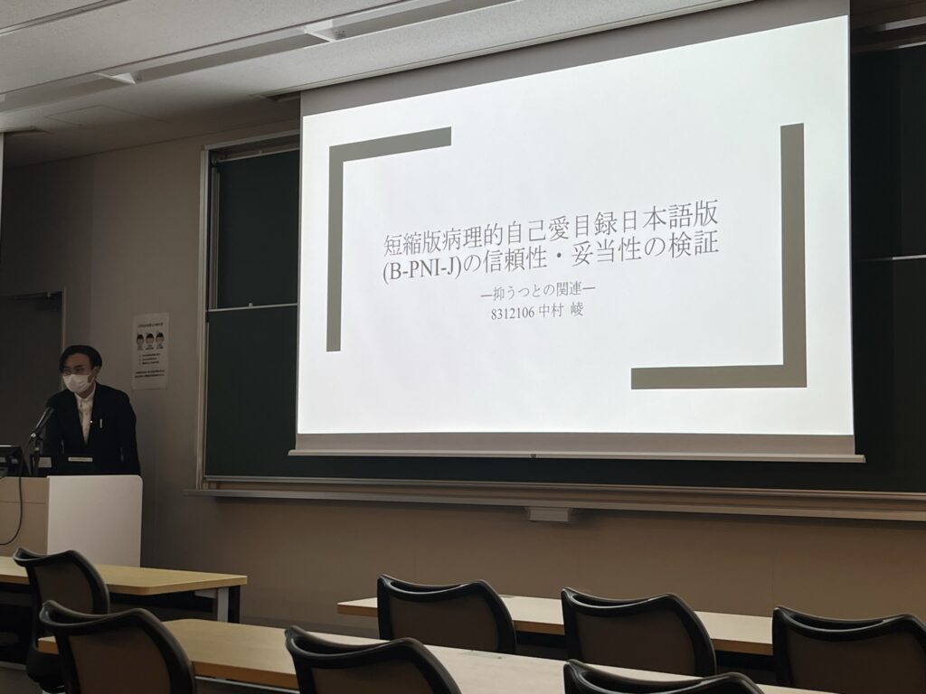 - 中村崚さん(健康心理学研究室)「短縮版病理的自己愛目録日本語版 (B–PNI–J) の信頼性・妥当性の検証――抑うつとの関連――」