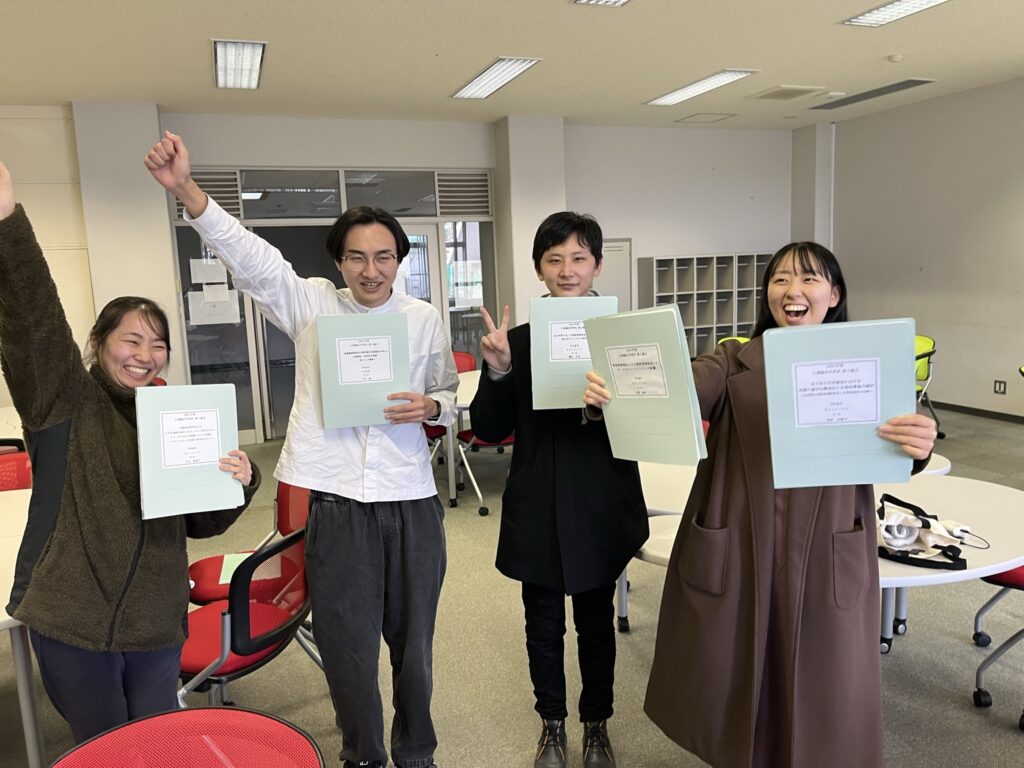 先月1月20日(金)、5名の大学院2年生が修士論文を提出しました(昨年9月に行われた中間発表会の様子はこちら)。年末年始返上で執筆に取り組んだ学生は、無事提出を迎えてこの笑顔(1名は、時間の都合上写真には写っていません)!