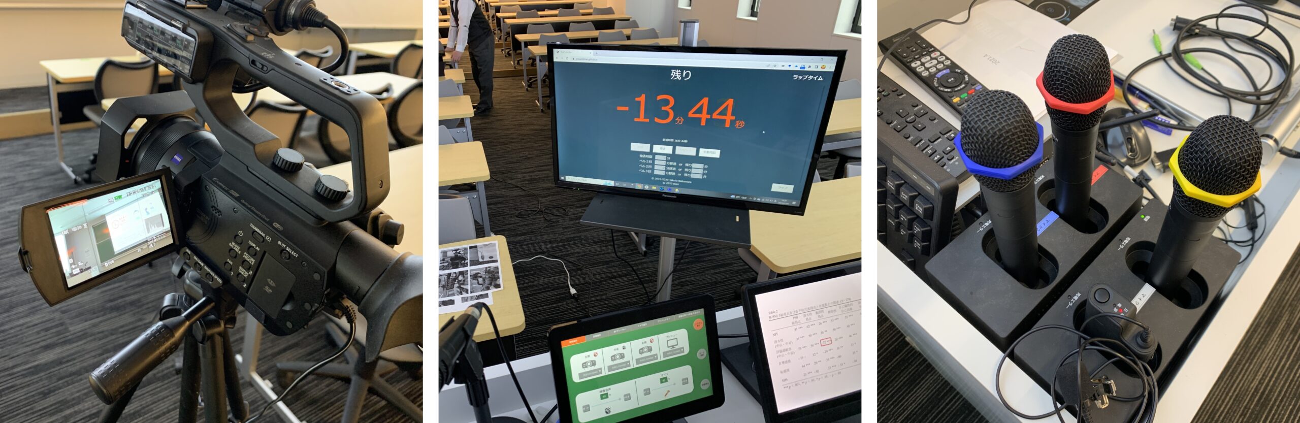 会場の設営にあたっては、大学における快適なICT環境の整備を一手に司るICTサービスセンターの力を借りるべく、IR室の片桐重和助教にサポートを頼みました。ハイブリット開催用のビデオカメラの設置や、発表者のためのプレゼンタイマーの設置、快適な質疑応答のためのマイクの準備など、かゆいところに手が届くきめ細やかなサポートは、とても心強いものでした。