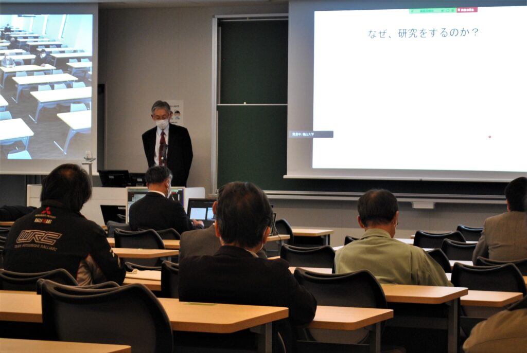 今回の最終講義は未来創造館の講義室で開催され、演題でもある「なぜ、研究をするのか?」という問いかけに対し「楽しいから、面白いから、研究するのだ」という自身のスタンスを紹介されました。また、これまで取り組んできた研究を振り返りながら、炭素繊維シートによるコンクリート構造物の耐震補強の研究、乾式吹付け工法による耐震補強の研究が、1995年の兵庫県南部地震阪神淡路大震災、2011年の東日本大震災の甚大な被害を目の当たりにしたことによって注目されてきた経緯を説明されました。