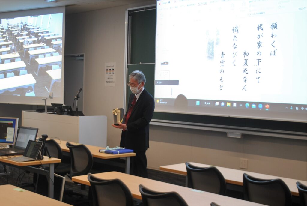 宮内教授は研究で取り組んできた耐震補強の知識を活かし、これからは実家建物の整備に励むとのことで、春のこの時期に詠まれた西行の句を本歌取りした一句を披露されました。また、最終講義の開催前には、自身で作曲された音楽を流し、非常に多才な一面を見せていただきました。個人的な思い出ですが、災害対応技術についていろいろと教えていただいたことに大変感謝しています。宮内教授のこれからのご活躍を祈念しています。