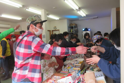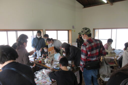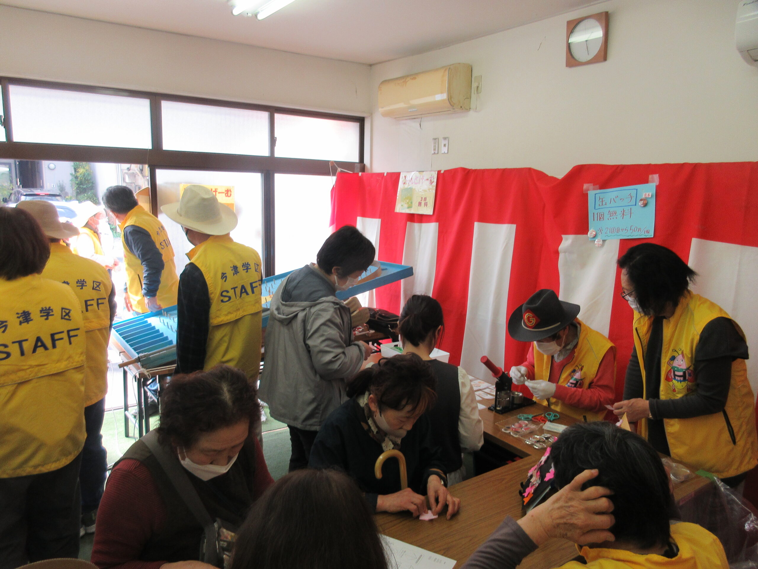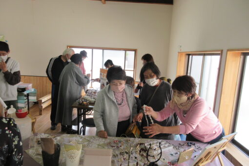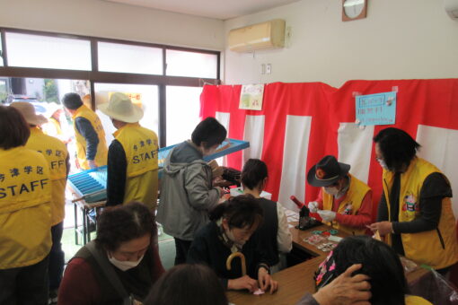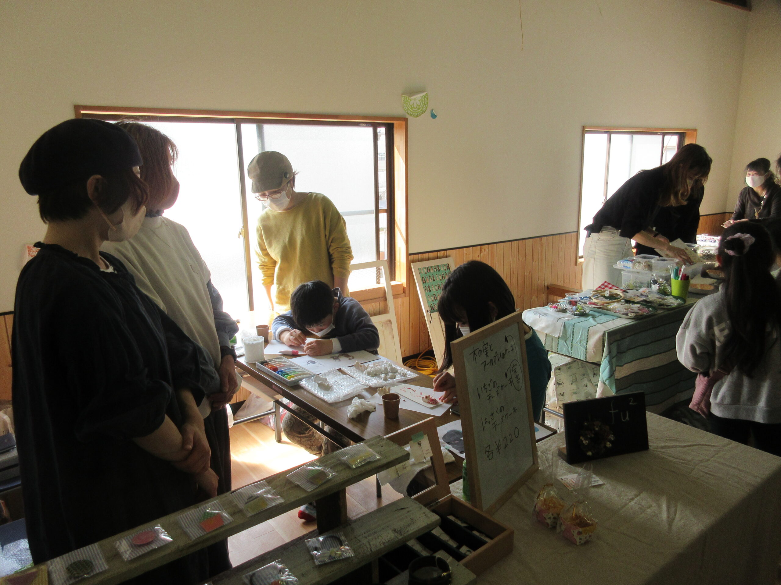 M亭マルシェは、プロジェクトMと今津学区まちづくり推進委員会との共催で、M亭で開いてきた盛りだくさんの「市場(マルシェ)」です。今まで丸2年間開催できずにいましたが、コロナ禍が落ち着いてきたので今年はぜひやろう!ということになって、3月12日(日)に盛大に開催しました。入り口ではコリントゲームや缶バッジ作りなどの遊びのコーナー、1階は駄菓子やケーキ、せんべいや革細工、ハンドメイド雑貨の販売、2階では手づくりアクセサリーやイヤリング、アロマストーン、エッグポプリなどを作るワークショップなど、様々な「お店」11店舗が集まりました。