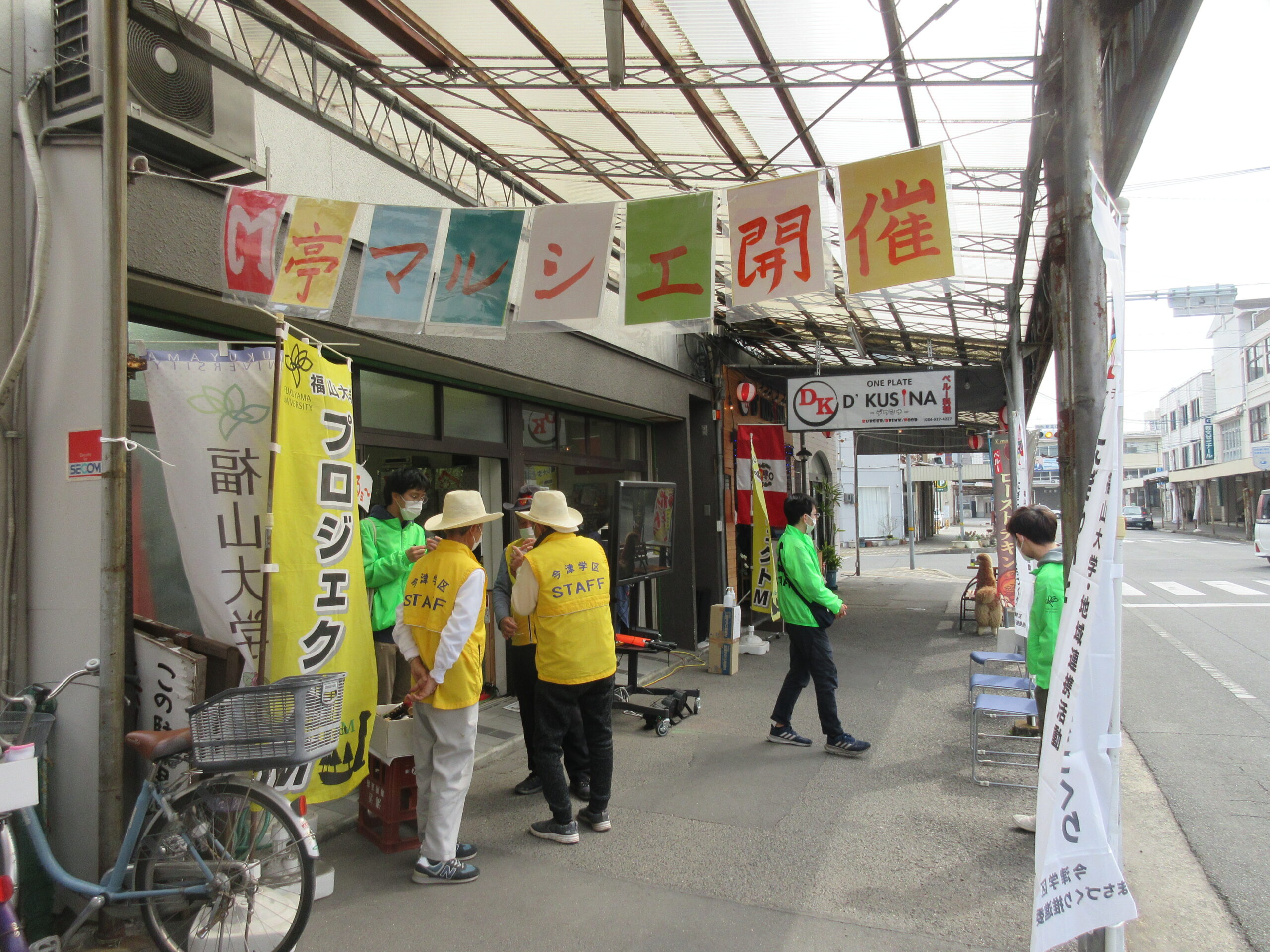 学長から一言:松永駅前の活性化を図るための本学の公式組織であるプロジェクトMが、駅前の常設活動拠点のM亭で久し振りに面白いことをやってくれました。地元の今津学区まちづくり推進委員会と共催の「ミニ市場」には大勢の人が集まり、賑わいを見せたようです。この賑わいが一時で終わらないようにするためにはどうすれば良いか。まだまだ頭を働かす余地があるようです。ガンバレー、じいじ隊長とプロジェクトに集う人たち!