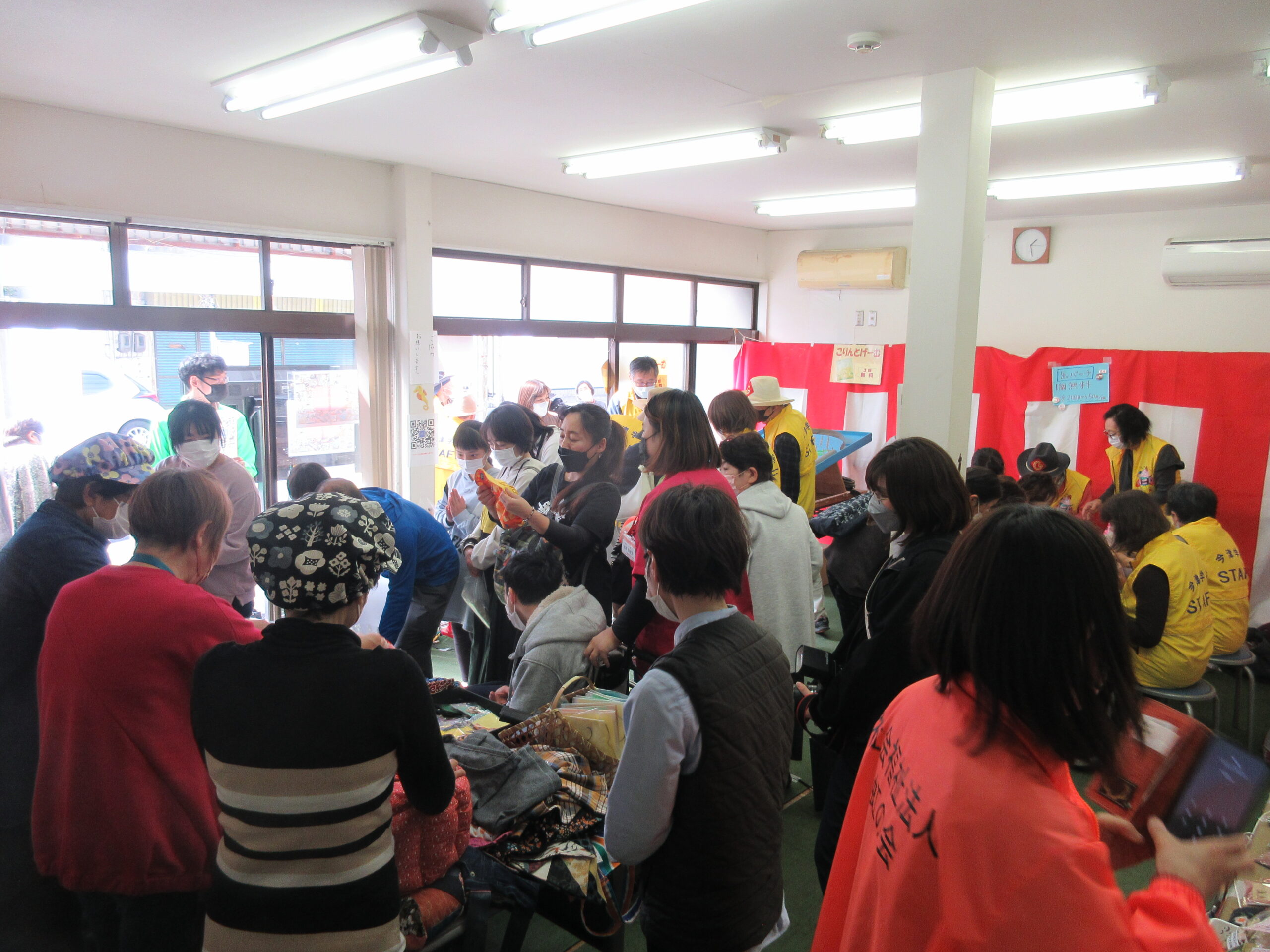 1階の販売コーナーでは、次々とお客さんがお菓子やいろいろなグッズをお買い上げ下さいます。開始の時に私もちょっとだけ挨拶して「お客さんが少なくても、我々はとにかく楽しみましょう」と言ったのですが、どっこい、予想を大きく外れて、楽しむどころかチョー忙しいという時間が続きます。お店を開いて下さった方の中には「のどが渇く!」という声も・・急遽飲み物の差し入れをしたほどです。社会福祉法人「虹の会」からも沢山の方に来ていただきました。