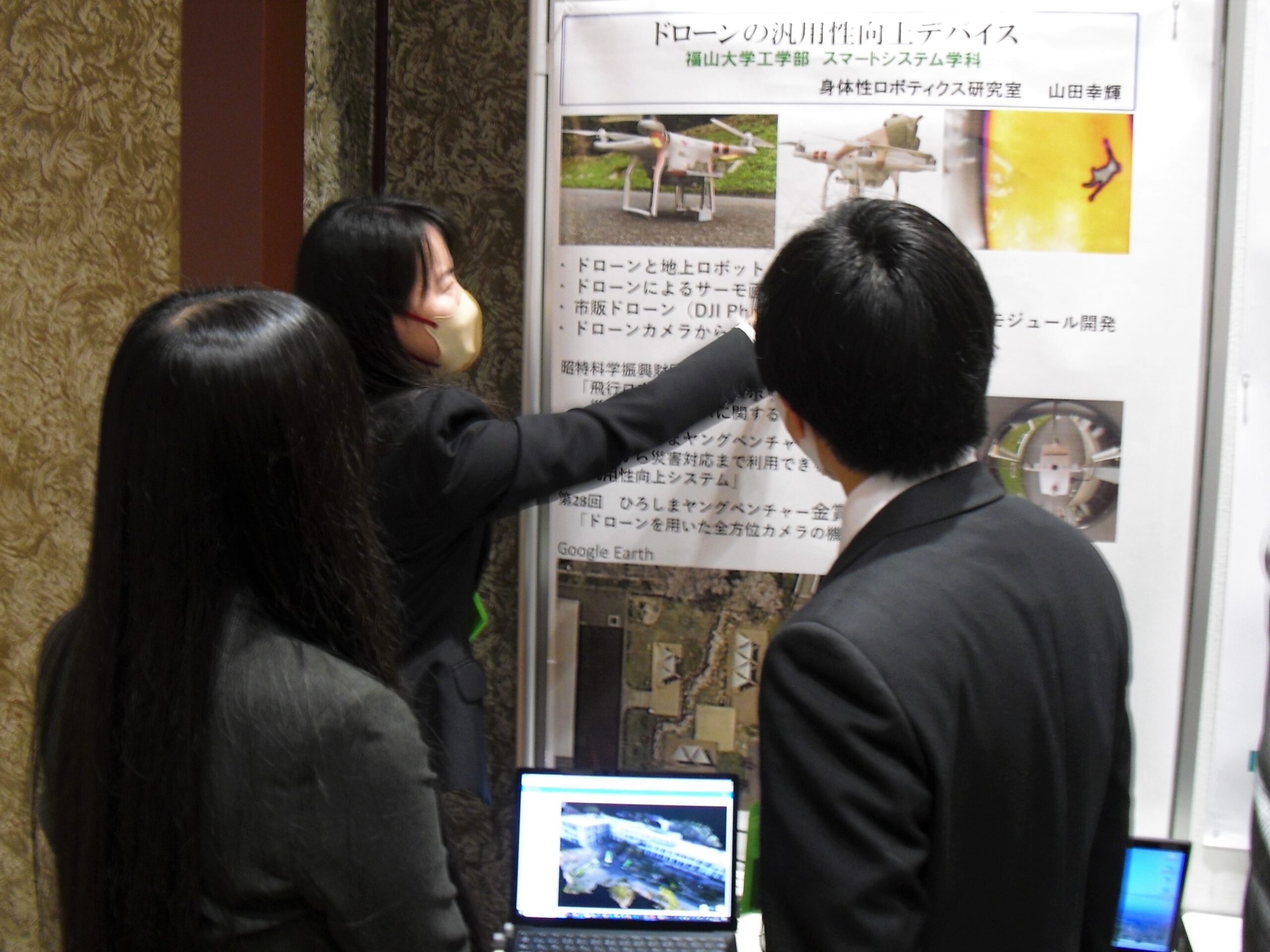 また、大学院生でも、電子・電気工学専攻から私の研究室のゼミ生である村上力丸君と本田義典君が「オリジナル全方位カメラの画像処理とアプリケーション適用」という題でポスター展示しました。会場には、これまで開発してきたデバイスを持ち込み、多くの研究者や起業の開発担当の方に興味を持っていただきました。さらに、研究室で開発している小型ロボットも展示したので、関東地区でロボットコンテストに取り組んでいる学生の方からデバイスの作り方やロボットの動かし方などを熱心に質問されていました。