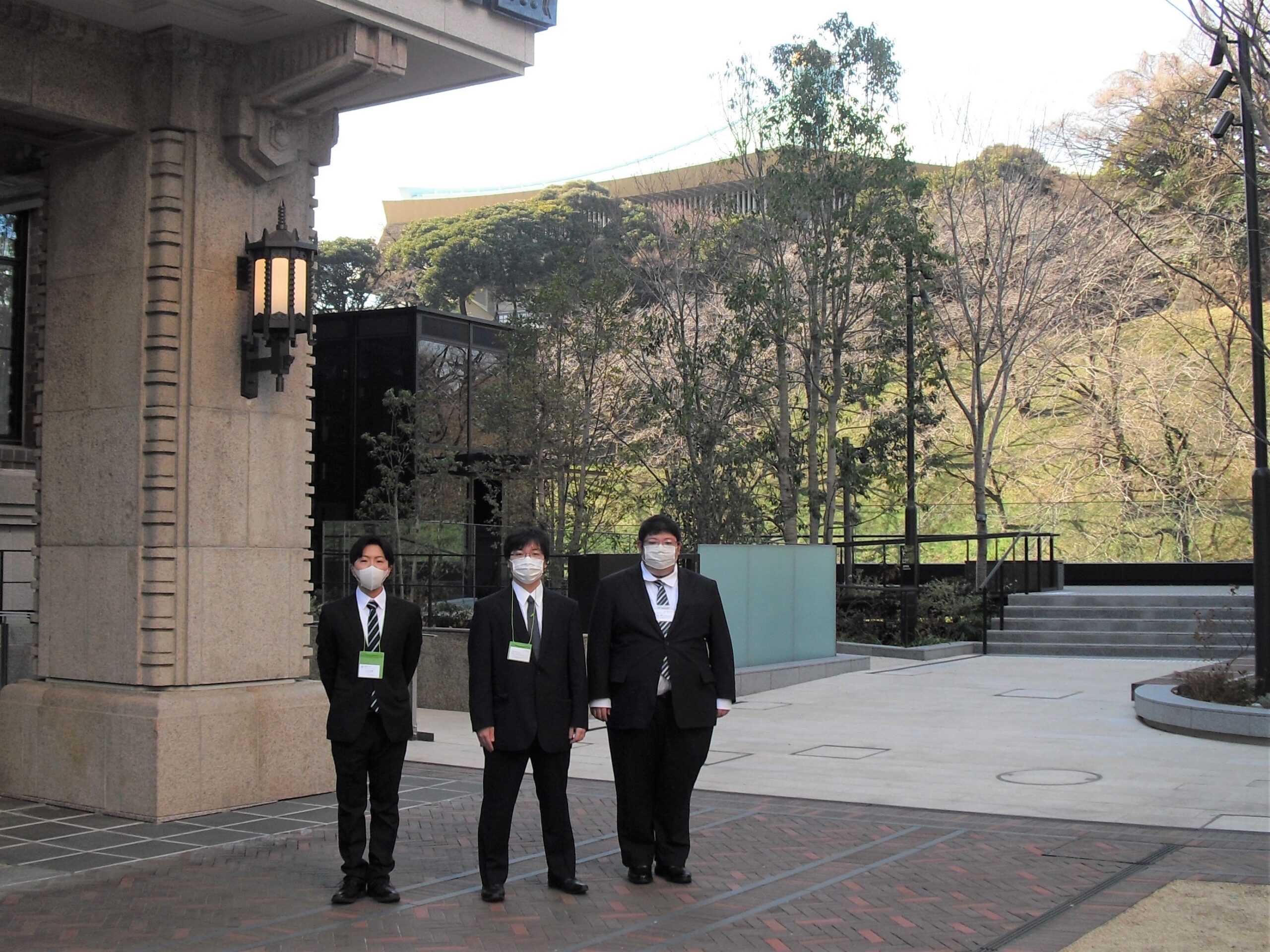 九段下カンファレンスの玄関で武道館を背景に記念写真(左から山田君、村上君、本田君)