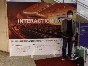 3月8日(水)~10日(金)の3日間にかけて、東京の一橋にある学術総合センターにて開催されたインタラクション2023にて、情報工学科4年生の田邊さんがデモ発表を行いました。なお、デモ発表前の30秒研究紹介の様子はYoutubeにも中継されています。