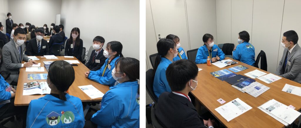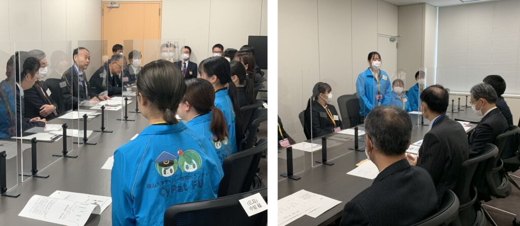 若手職員の皆様との懇談会は、終始和やかに行われました。職員の皆様にサイバー警察局の仕事について伺ったり、他のボランティア団体に所属する学生に状況を聞いたりしながら、自分たちの活動やその特徴についても伝えることができたと思います。CyPat FUのスカイブルーのユニフォームは、どこにいても存在感抜群!右下の写真は、作成経緯や作成時の工夫をお尋ねくださった職員の方に、背面のプリントも見ていただきながら皆で説明している様子です。