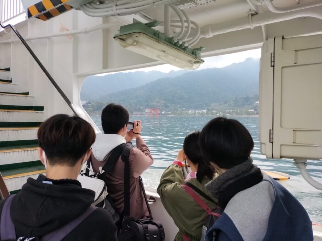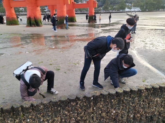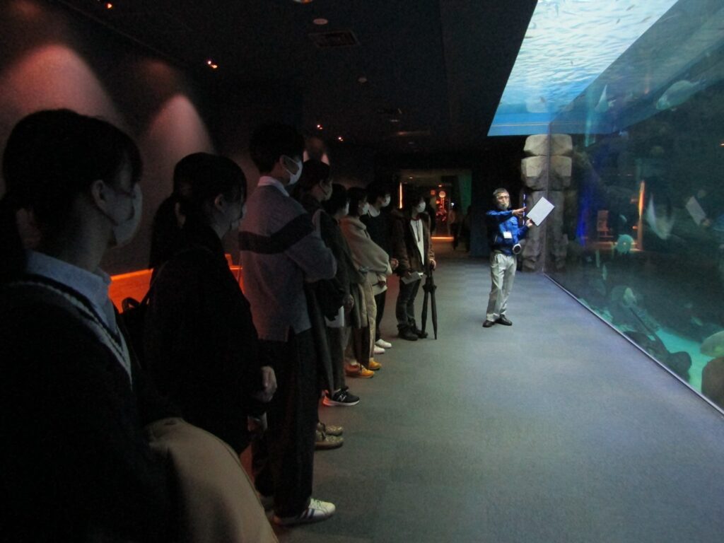 朝8:30にスクールバスにて大学を出発し、一路宮島へ。12:00開始の水族館解説ツアーに遅れないよう、焼きガキの美味しそうな匂いに後ろ髪をひかれながら、島内を駆け足で移動しました。水族館で開催されている解説ツアーでは、展示生物の説明や飼育員だからこそ知る裏話などを聞かせていただきました。