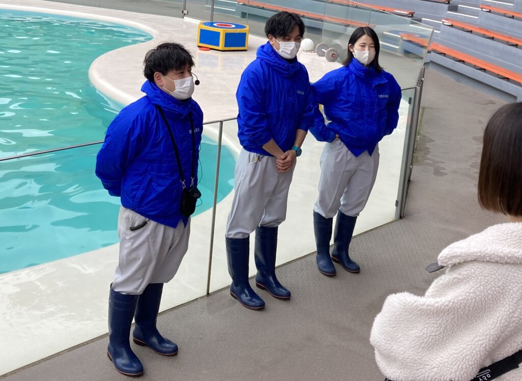 宮島水族館には、海洋生物科学科の卒業生3名が勤務しています。3名はいずれも在学中に学芸員の資格を取得して卒業し、株式会社冨山学園に入社して宮島水族館で飼育員として働いています。今回のツアーでは、後輩たちのために3名の先輩が勢揃い!! 特別にライブプールでの交流の場をご提供いただきました。