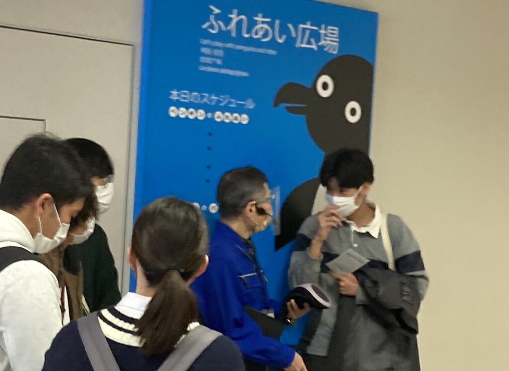 学友会海洋生物研究会は、コロナ禍のために数年にわたって活動を休止せざるを得ない状況でしたが、令和4年度からは、松永湾の清掃活動や福山エーガル8シネマズでのミニミニすいぞくかん、三蔵祭への出店など、多くの活動を精力的に再開しました。そこで今回は、1年間の頑張りを労うため、部員の多くが興味を持っている水族館を訪問し、そこで働く学芸員との交流を通して水族館の展示や仕事について学ぶ特別ツアーを企画しました。ツアーには、1~3年生の部員19名が参加しました。