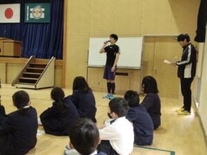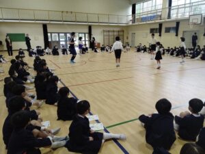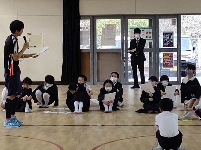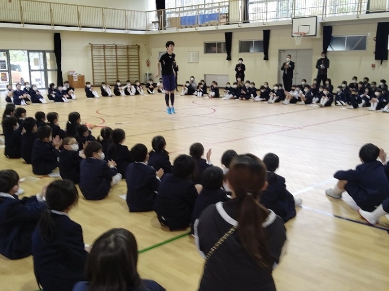 3月9日(木)の朝礼で全児童約200名に体育館へ集まってもらいました。道原教授と松岡准教授の引率のもと、本学のすぐ近くにある西藤小を訪れた一行は、角君の縄跳びテクニックの披露、五重跳びチャレンジ、児童代表者らとの縄跳び対決、二重跳びの極意伝授を行うなど、小学生との交流会に臨みました。