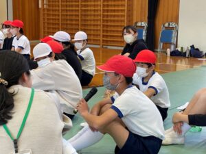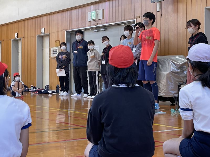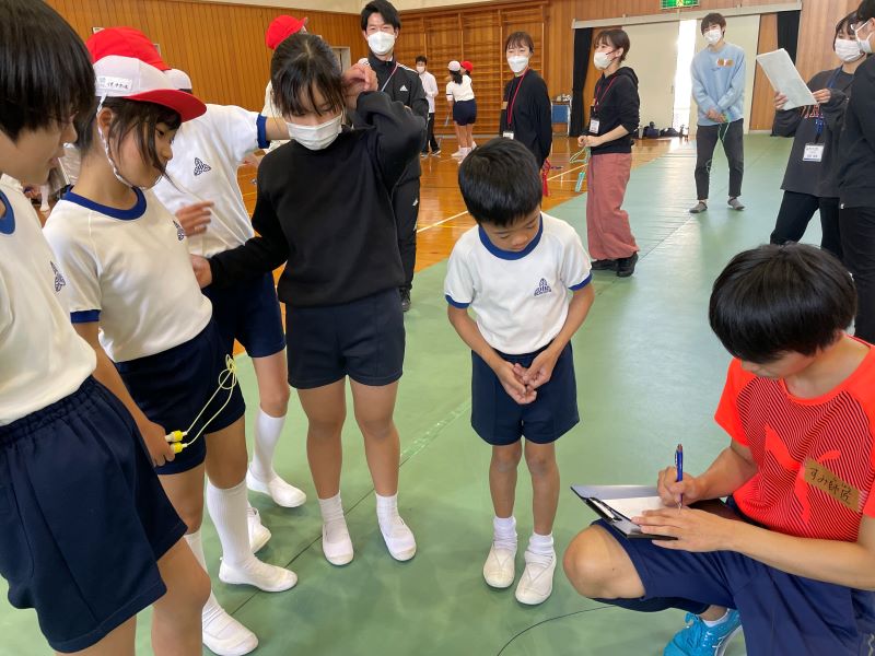 当日、学生はニックネームを胸に貼り、花田さんの司会のもと学生の自己紹介から始まりました。交流会では、‘角師匠’の縄跳び披露、NiziUパフォーマンスの他、持久対決、30秒で何回跳べるか、縄跳びリレーなどを行いました。もちろん大学生も参加!縄跳びリレーは、小学生と大学生混合の6チームと角師匠ひとりチームとで競争しました。小学生も大学生も角師匠も全力です!