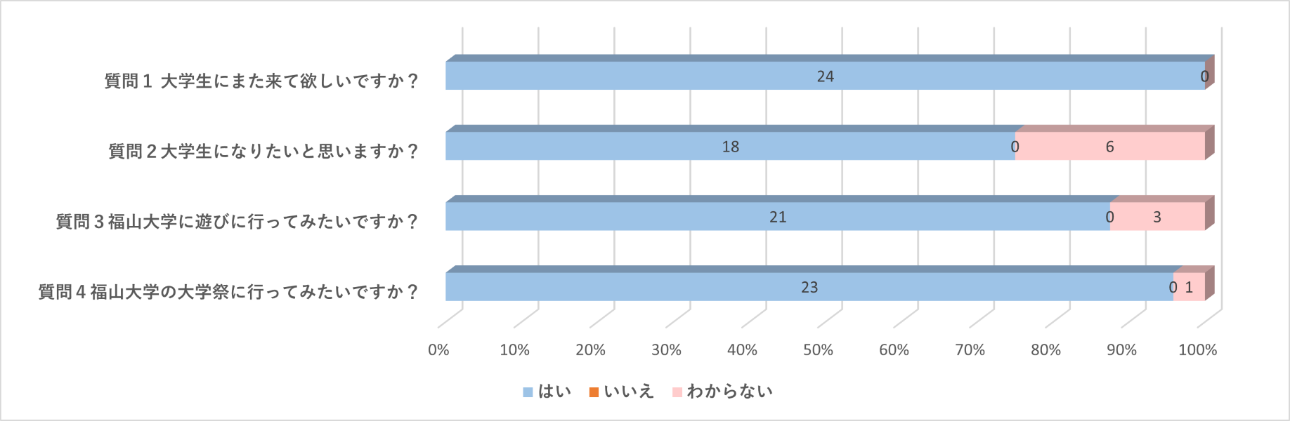 回答してくれた小学生全員が「大学生にまた来て欲しい」と回答してくれました。この結果に、学生たちは胸をなでおろすとともに、本当に嬉しく温かい気持ちになりました。一方で、「勉強が難しそう」とのコメントも多く、小学生に学問や研究の内容を分かり易く説明し、その面白さを伝えることの難しさを身に沁みて感じました。