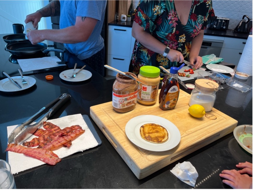 We got up around 9am and ate pancakes made by our host parents, Katie and Ben. Fruits, bacon, and various sauces were prepared, and it was delicious to eat in various combinations.
