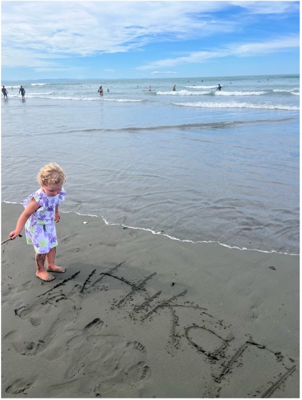 ゴンドラの後、ビーチへ連れて行ってもらいました。海はとても綺麗でした。phoebeとpiperという名前の2人の子どもは、とても楽しそう。私たちも海水に足を浸したり、砂浜でお絵かきをしたりして楽しみました。