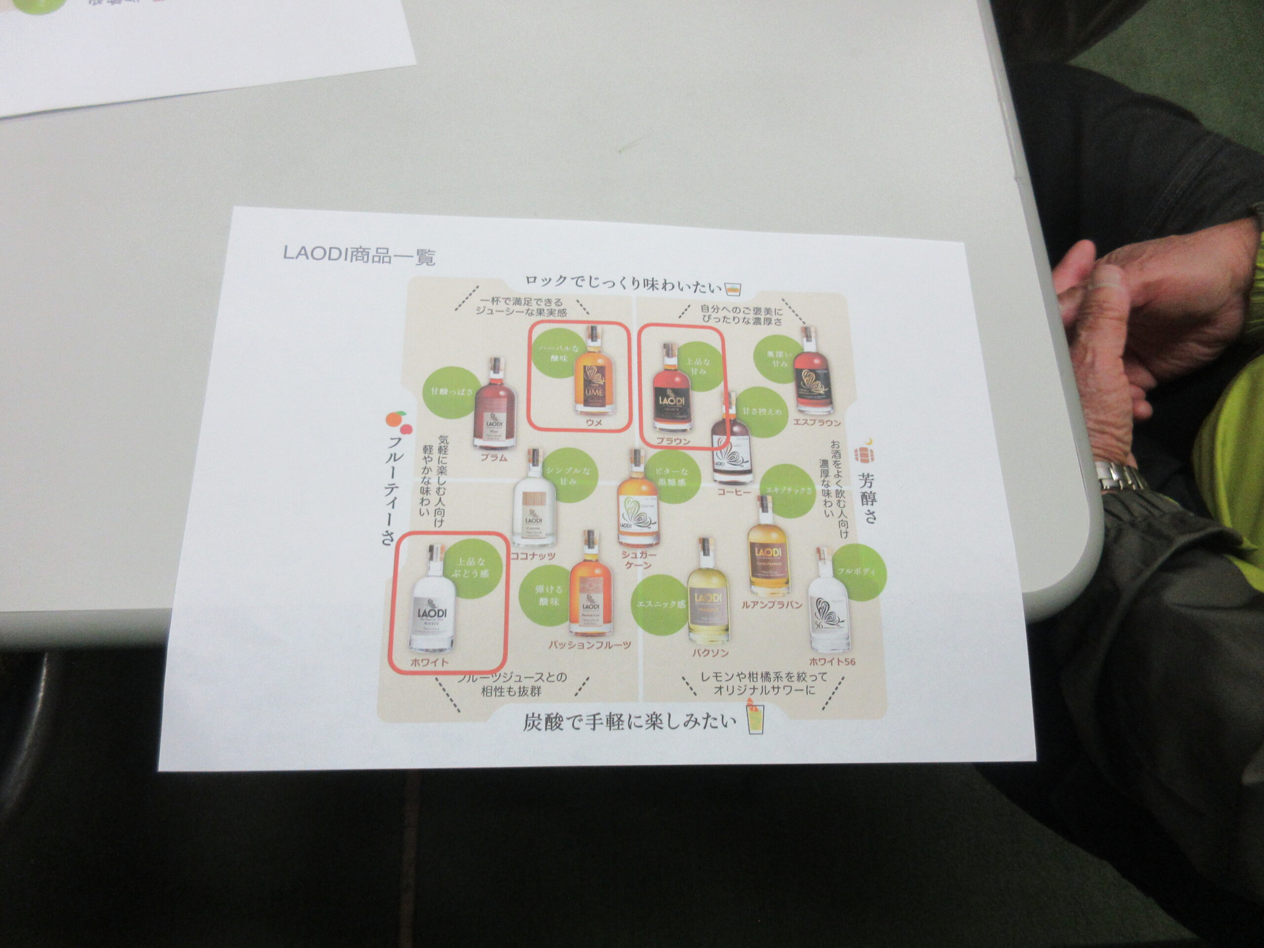 後半は福田酒店さんのラム酒の楽しみ方(おいしい飲み方)講座です。井上さんが「自分は作る人。ソムリエじゃないからおいしい飲み方なんておこがましい。」とおっしゃるもので、松永で唯一LAODIを扱っている福田さんに、飲み方講座をお願いしました。この時のために、店主の福田哲也さんはLAODIジャパンの商品案内にこの日準備した3種のラベルの商品にマークを入れたチラシを作ってくださった上に、コーラ、炭酸水、水、氷なども準備して、「まずストレートで試してください。その後お好みで色々なもので割って飲んでみてください。オンザロックもおいしいですよ。今日は3種類持って来ていますから、それぞれのお酒で試してください。」などといろいろ説明をして下さったのですが・・集まったお客さんは、まずは飲んでみようという人ばかりで、なかなか落ち着いて説明を聞いてくれません。早く注いでもらって、早く飲みたい人たちです。ラムを注いでいるコーナーに殺到です。