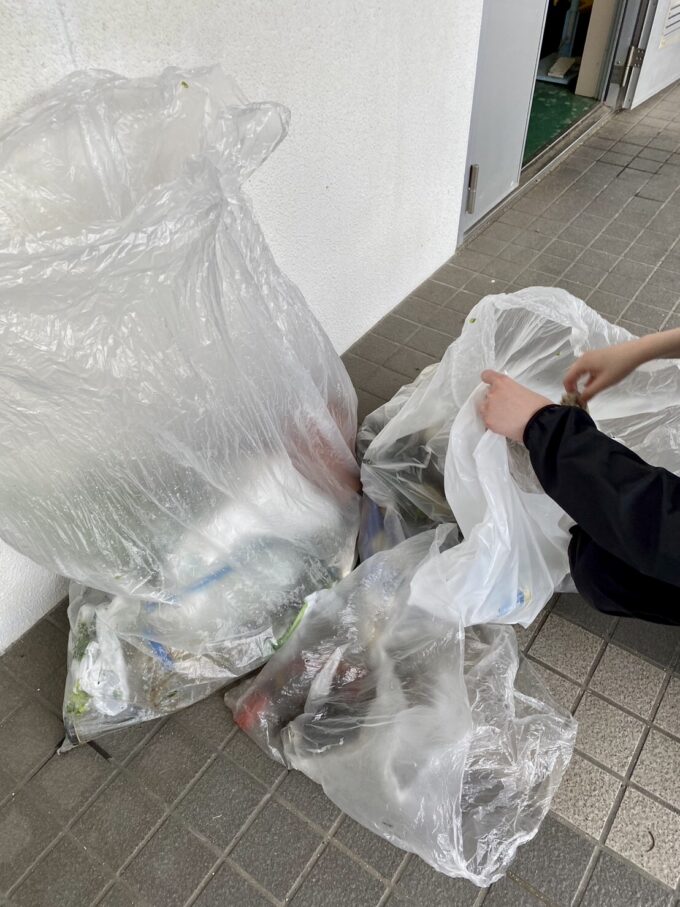 みんなで協力しての清掃活動。分別作業中には、容器に隠れていた小さなカニを無事救出🦀
