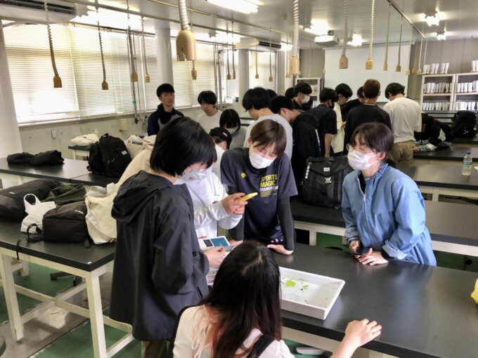 グループごとに採集した生物を一旦実験室に持ち帰り、図鑑などを用いて種を同定します。