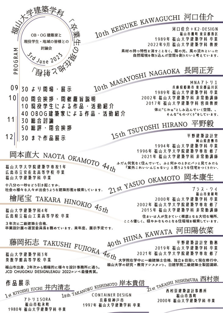 建築学科では、現在、「第16回福山大学建築学科卒業設計展2023」を福山市内で開催しております。今年度はじめて、その同時開催イベントとして、6月3日(土)にまなびの館ローズコム4階大会議室で、「卒業生の現在地と射程」と題したOB・OG建築家5人による作品紹介と現役学生や市民の皆さまを交えた討論会を開催しました。また会場内には、8人の登壇者に加え、3人の建築家の皆様の作品を図面や模型などを展示しました。