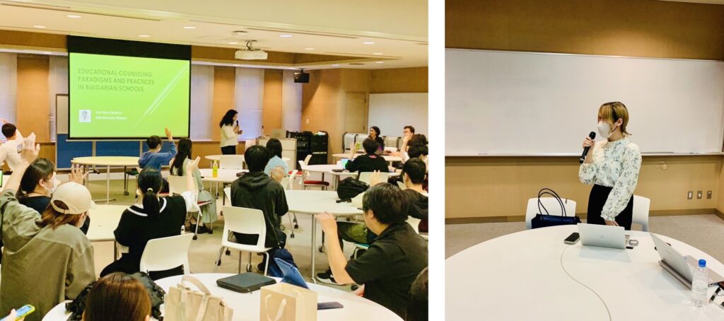 教員を目指す学生たちが受講する講義において、ブルガリアの学校におけるスクールカウンセリングのパラダイムや主な課題、インクルーシブ教育等について、広く学びました。教員や、学内外の専門家がチームとしてサポートすることの重要性を知り、多くの学生は深く頷いていました。