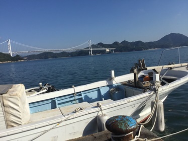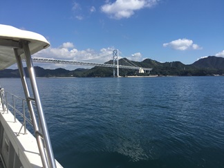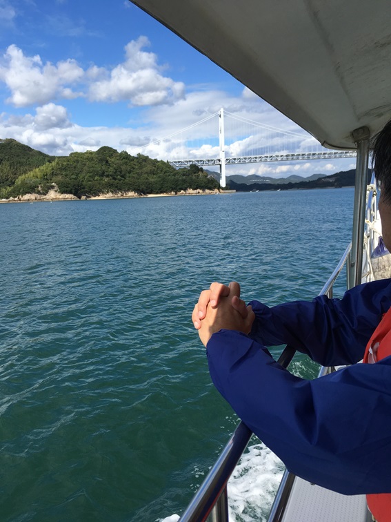 さて、帰りは海底カメラ「容器」は海の中に浸かったまま港へと進みます。少し向かい風のある中を進むには船の速度をぐーんと落とします。船長さんは1ノット、2ノットと速度計を読みながら慎重に前進させます。とてもゆったりして気持ちいい。これこそ船旅じゃない。この因島大橋の下も海上交通の要衝となっており、大型の船舶があちこちに見えます。行き交う船に向かって心の中から手を振りながら港へ向かいました。