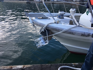 ・・・ってノリだったのですが、福山大学マリンバイオセンターの フジイ船長さんが渋い顔 なんですよね。「重すぎるから船の上に乗せられないので、船のへさきから海中に吊るして現場に行くよ」って。理由を聞くと、不安定な船の上で重いものを扱うのはとっても危険なことなので、仕方がないんですって。まあ、海に行けるんだからしょうがないね。ということで、機嫌を直して船着場に到着~~。